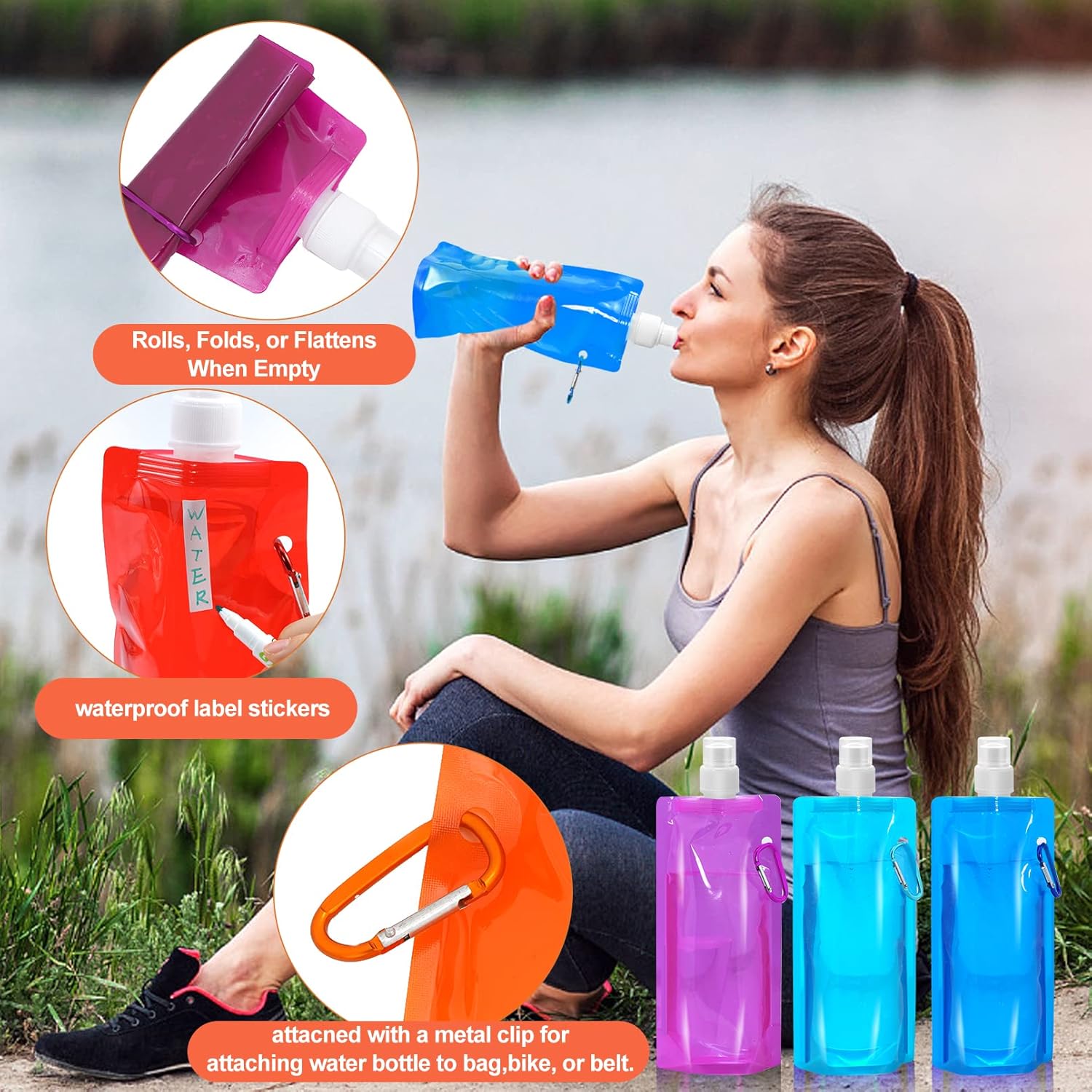 10 Pcs Collapsible Foldable Water Bottle 480ml, Leak Proof with Carabiner, BPA Free, Reusable Drinking Bags for Travel, Gym, Camping, Hiking