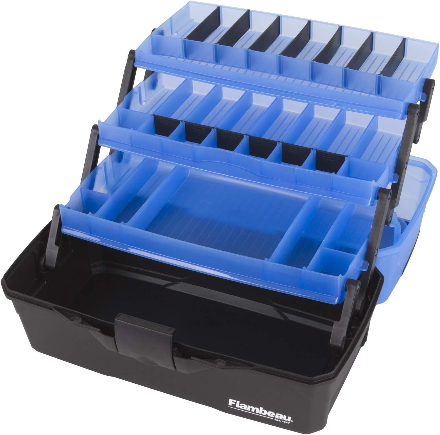 Flambeau Outdoors 6383FB 3-Tray Tackle Box – Classic Fishing Lure Storage Organizer, Large Portable Tackle Box, 32 Tray Compartments, Frost Blue/Black